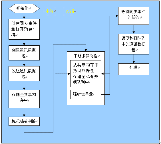 過程說明:本端處理器作初始化,創建同步事件,打開消息通訊句柄, 同步事件用于讀取數據時任務阻塞,然后創建通訊數據包并且發送,發送例程將數據存儲在共享緩沖區內,最后觸發對方中斷。對端處理器進入中斷響應,首先中斷例程分析共享數據區的通訊數據狀態,發現某通道有新的未處理數據后,將其拷貝至自己的私有內存空間,并清理自己的共享數據區狀態,然后釋放在等待中的通訊任務的信號量,使讀通訊數據包的任務解除阻塞狀態,從私有數據區讀取通訊數據包并作相應處理。